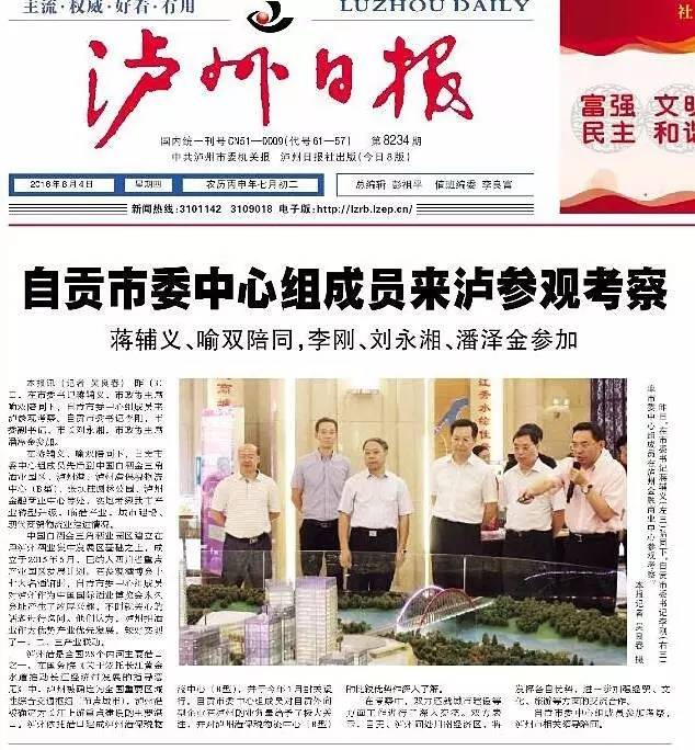 8月3日,自贡市委中心组成员在自贡市委书记李刚,自贡市委副书记、市长刘永湘,市政协主席潘泽金带领下,莅临泸州金融商业中心【佳乐世纪城】考察。泸州市委书记蒋辅义,市政协主席喻双等市领导陪同考察。